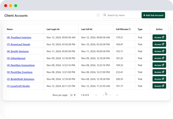 Offer AI-powered voice automation as your own SaaS. Manage clients, track performance,and scale effortlessly - no developers needed.